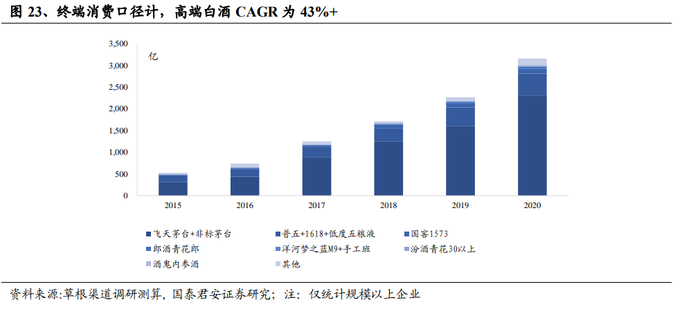 根据统计局数据测算,我们估测2015-20年白酒行业市场规模CAGR为9%,但是估测次高端、高端价位市场规模CAGR分别为22%、25%,若按终端消费口径计算,高端白酒对应市场规模CAGR为43%,中高价白酒扩张速率远高于行业平均。伴随次高端及高端白酒快速扩张,白酒消费结构也经历了剧烈变化,根据测算,2015-2020年,高端白酒规模占比由14%提升至27%,次高端白酒占比由7%提升至12%,产业结构优化明显。