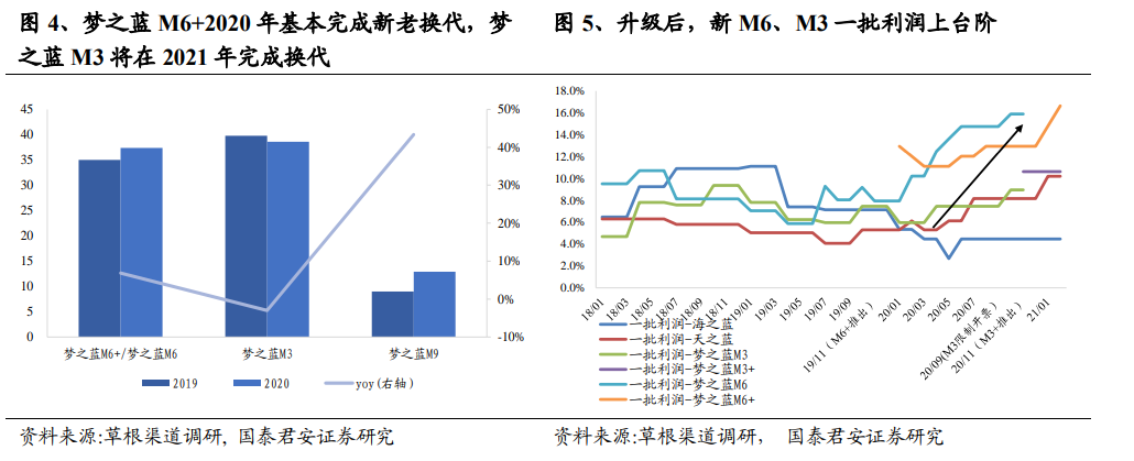 洋河梦之蓝产品换代进度符合预期:梦之蓝M6+在2020年基本实现对老M6的替代,一批渠道利润率由换代之前的9%提升至2020年初的16%,渠道推力得到明显改善,水晶版M3在21年初也已完成终端导入工作,进入动销阶段,渠道利润率由7%提升至11%,渠道反馈积极,预计新M3将会在2021年完成对老版本的替代。