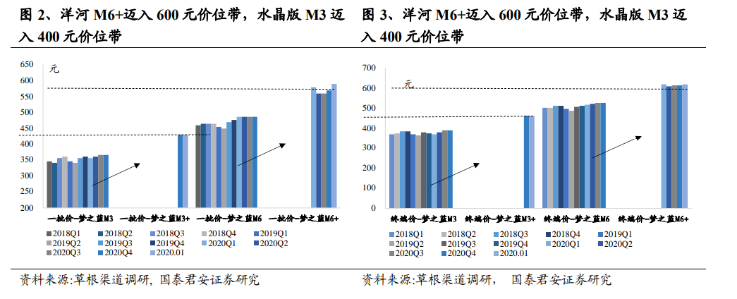 疫情之下,洋河、今世缘加速推进产品升级,迈入更高价位带。洋河最早启动大规模产品升级工作:2019年底,洋河推出梦之蓝M6+,换代后M6批价由跃480元升至560元,终端价格成功跃至600元;2020年底,洋河推出水晶版梦之蓝M3,梦之蓝M3批价由360元提升至430元左右,终端价位迈入400元。
