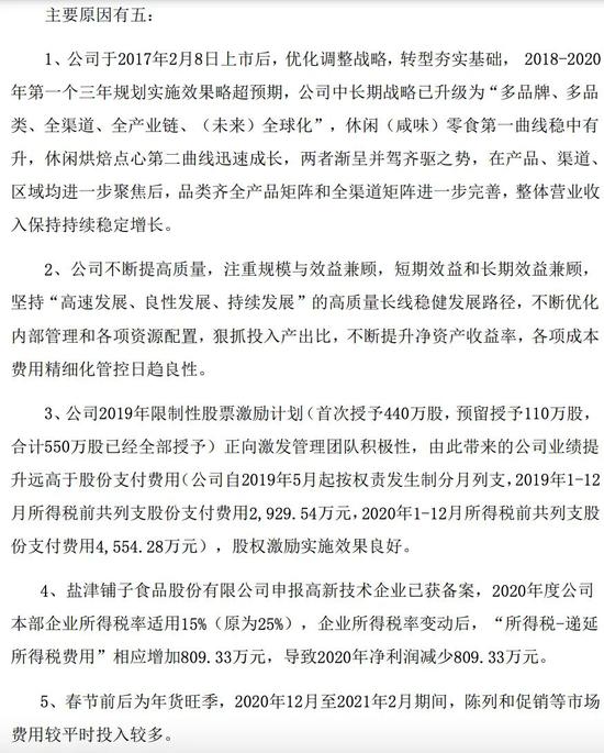 其次,盐津铺子表示,其申报高新技术企业已获备案,2020年度公司本部企业所得税率适用15%(原为25%)。企业所得税率变动后,“所得税-递延所得税费用”相应增加809.33万元,导致2020年净利润减少809.33万元。