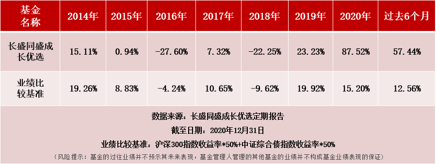 长盛同盛成长优选2014年、2015年、2016年、2017年、2018年、2019年、2020年、过去6个月净值增长率分别为15.11%、0.94%、-27.60%、7.32%、-22.25%、23.23%、87.52%、57.44%,同期业绩比较基准收益率分别为19.26%、8.83%、-4.24%、10.65%、-9.62%、19.92%、15.20%、12.56%。数据来源:长盛同盛成长优选定期报告,统计日期:2014 年11月5日至2020年12月31日,业绩比较基准:沪深300指数收益率*50%+中证综合债指数收益率*50%。