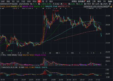 而就在3月1日A股普涨的大好行情下,中信证券却特立独行,以盘中重挫逾8%的异动,挑动起投资者的神经。3月1日和2日,该股分别下跌5.98%和1.8%,两天跌幅7.67%,股价收于25.16元/股,A股市值蒸发222.54亿元。