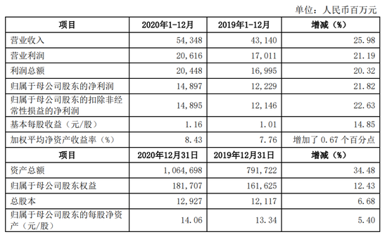 据东方财富年报,2017年—2020年,该公司归属于上市公司股东的净利润分别为6.37亿元、9.59亿元、18.31亿元、47.8亿元,2018年、2019年、2020年分别同比增长50.52%、91.02%、161%;营业总收入分别为25.47亿元、31.23亿元、42.32亿元、82.39亿元,2018年、2019年、2020年分别同比增长22.64%、35.48%、94.69%。