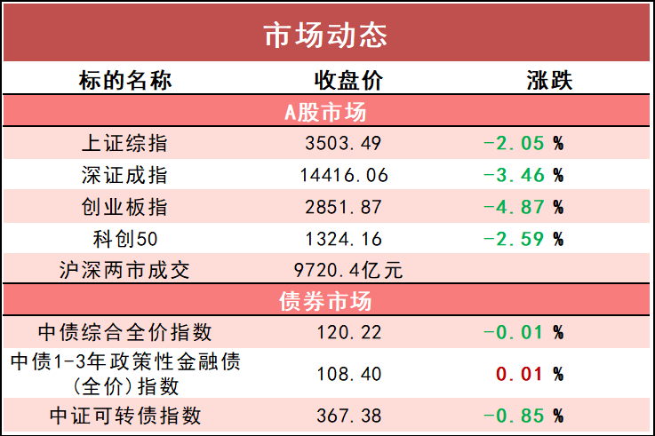 上证指数收盘下滑2.05%,守住3500关口;创业板指跌4.87%;上证50指数跌2.85%。两市全天成交金额9720亿元。