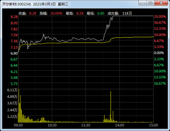 3月4日,开尔新材再次涨停。这是其连续第3个交易日涨停,创下了3天“60厘米”的佳绩。