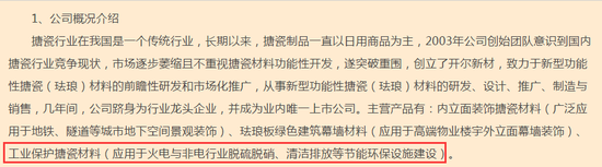 开尔新材在一份投资者关系记录中表示,公司主营产品有:内立面装饰搪瓷材料(广泛应用于地铁、隧道等城市地下空间景观装饰)、珐琅板绿色建筑幕墙材料(应用于高端物业楼宇外立面幕墙装饰)、工业保护搪瓷材料(应用于火电与非电行业脱硫脱硝、清洁排放等节能环保设施建设)。