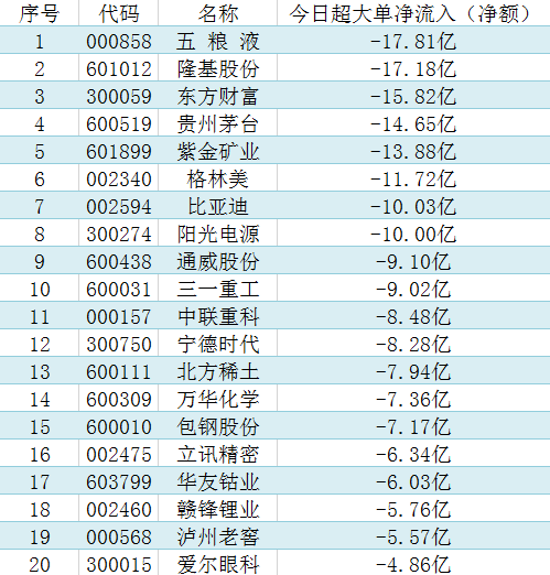 从超大单流出居前个股来看,五粮液、隆基股份、东方财富、贵州茅台、紫金矿业、格林美、比亚迪、阳光电源等居前。