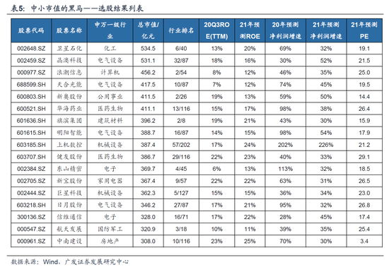 300-600亿的市值公司,从20年报预告来看优势在于估值分位数相对合理、并体现出更强的业绩增长。因此我们在这一维度重点寻找21年高增长延续、盈利能力稳定及估值合理的性价比。