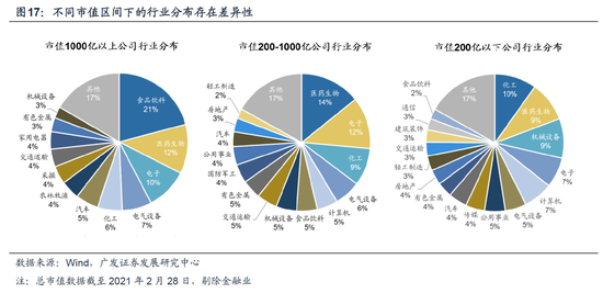 由于A股市值结构的问题,A股大市值公司的行业分布更为聚拢,而中小市值公司的行业分布更为发散。A股剔除金融,目前总市值1000亿以上的公司行业分布更为聚拢,前三大行业占据44%的市值规模;而市值200-1000亿的公司中、市值200亿以下的公司,行业分布更为分散。