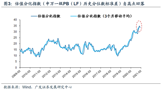 伴随着前述背离的逆转,A股估值分化的情况亦出现收敛。以申万一级行业PB估值的历史分位数离散度作为估值分化程度的衡量。自19年起,该指数呈现出快速上行趋势,并触及了04年以来的最高水平。但随着背离的逆转,行业间估值分化情况已出现收敛。