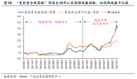 从20Q4基金季报透露的信息来看,这一正螺旋反馈有了一些微妙变化。“复制重仓股”的策略自19年以来虽然可以继续跑赢市场,但已经很难在相对收益的考核机制下跑赢对手。“复制重仓股”策略的构建方式为在基金季报披露后买入持有基金前50大重仓股,并按照重仓市值比例进行仓位分配,随后每季度根据基金季报披露的最新持仓情况进行调仓。复制策略相对收益不占优的现象会倒逼机构投资者“另辟蹊径”,从资金面寻找差异化的配置思路。