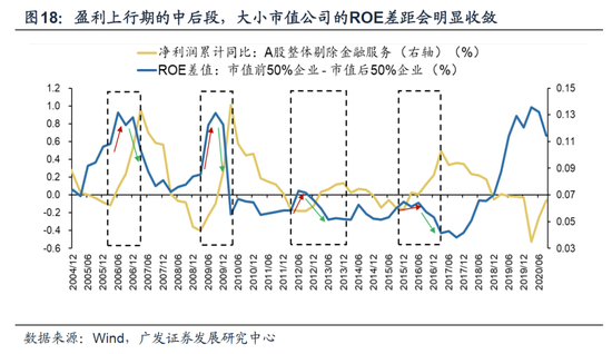 从基本面上来看,历史上经济/盈利修复的中后段,“大”“小”公司的业绩差距将进一步收敛。在每一轮盈利回落及触底回升的初期,大小市值公司的ROE差距会逐渐走扩;而在盈利上行期的中后段,大小市值公司的ROE差距会明显收敛。