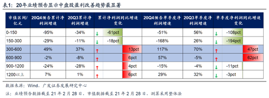 短期的变化是,“大票”相对“中小票”的业绩优势出现收敛,业绩预期与估值的匹配度失衡,使天平向中市值倾斜。回顾疫情后的企业盈利修复进程,市场偏爱的“大票”在市场地位、规模优势等因素支持下率先修复。但随着经济修复广度拓展与确定性抬升,中市值公司的业绩改善更为显著,与大市值公司的业绩差距继续缩小。其中,20年业绩预告显示,市值区间为300-600亿的公司20Q4累计净利润同比增速提升13pct,远超市值900亿以上公司。