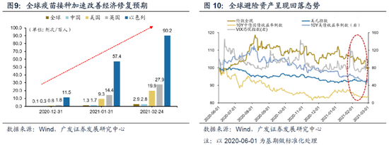 首先,随着“疫苗交易”占据主导,全球投资者追逐“确定性溢价”的诉求下降,2月以来全球避险资产回落。21年以来,世界各国加速开展疫苗接种,2月末较1月下旬、20年底的接种速度明显加快。与此同时,美国1.9万亿刺激计划得到众议院规则委员会批准,进一步降低了宏观经济的不确定性。在此背景下,黄金、美元、美债等避险资产纷纷出现回落,其中伦敦金现从年初至2月底的累计跌幅已接近9%。全球对“顺周期”品种配置倾向的上升背后是对“确定性”诉求的下降。
