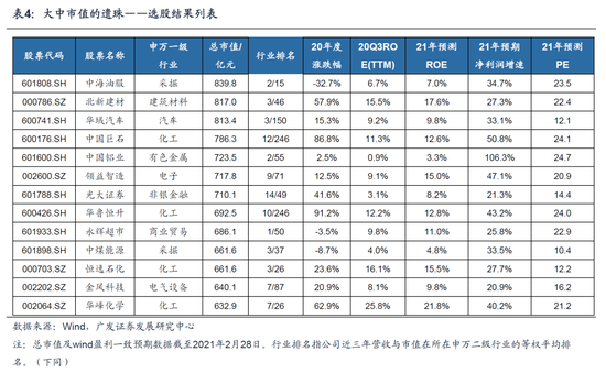 当前如何布局“市值下沉”与“行业扩散”?我们可以沿着业绩预告线索、21年景气预期、21年动态估值,挖掘中小市值的个股机会,其中一些细分行业的龙头会在资金配置从聚集到发散的过程中受到更多关注。