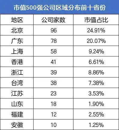 其中,500强公司大多分布在北京、广东、上海、香港、浙江、台湾等地,北上广三地公司累计市值在500强公司中占比过半。