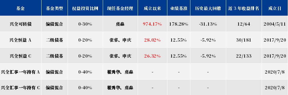 数据来源:兴证全球基金2020年四季报,兴全可转债混合型基金银河分类为偏债型基金(A类);兴全恒益债券型基金A银河分类为普通债券型基金(二级)(A类);兴全恒益债券型基金C银河分类为普通债券型基金(二级)(非A类);兴全汇享一年持有混合型基金A银河分类为偏债型基金(A类);兴全汇享一年持有混合型基金C银河分类为偏债型基金(非A类)。基金业绩截至2020年12月31日,复权单位净值增长率。兴全可转债基金近十年完整业绩及比较基准:2010(7.65%/-9.46%),2011(-13.68%/-14.66%),2012(1.70%/4.11%),2013(9.84%/-1.10%),2014(53.29%/51.92%),2015(6.70%/-20.00%),2016(0.93%/-10.90%),2017(7.62%/2.96%),2018(-5.79%/-4.98%),2019(24.75%/25.51%),2020(19.33%/8.20%);兴全恒益A成立以来完整业绩及比较基准:2017/9/20-2020/12/31(0.23%/0.00%),2018(0.26%/-0.73%),2019(13.65%/7.67%),2020(12.09%/5.26%);兴全恒益C成立以来完整业绩及比较基准:2017/9/20-2020/12/31(0.11%/0.00%),2018(-0.15%/-0.73%),2019(13.19%/7.67%),2020(11.65%/5.26%);兴全汇享基金成立于2020年7月8日,至2020年12月31日不满6个月,暂不展示业绩。基金投资须谨慎,请审慎选择。