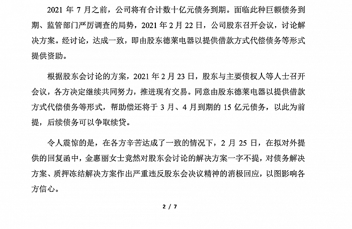虽然在2月22日的高特佳股东会议中曾讨论该事项,但是上述股东发布的通报中表示,金惠丽在拟对外提供的回复函中,对股东会讨论的解决方案一字不提,消极回应。
