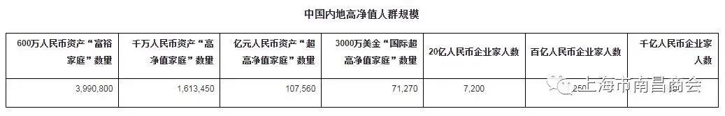 截至2019年12月31日,中国拥有600万人民币资产的“富裕家庭”数量已经达到501万户,比上年增加7万户,增长率为1.4%,其中拥有600万人民币可投资资产的“富裕家庭”数量达到180万户;拥有千万人民币资产的“高净值家庭”数量达到202万户,比上年增加4万户,增加2%,其中拥有千万人民币可投资资产的“高净值家庭”数量达到108万户;拥有亿元人民币资产的“超高净值家庭”数量达到13万户,比上年增加3.000户,增加2.4%,其中拥有亿元人民币可投资资产的“超高净值家庭”数量达到7.7万户;拥有3000万美金的“国际超高净值家庭”数量达到8.6万户,比上年增加2.100户,增加2.5%,其中拥有3000万美金可投资资产的“国际超高净值家庭”数量达到5.4万户。