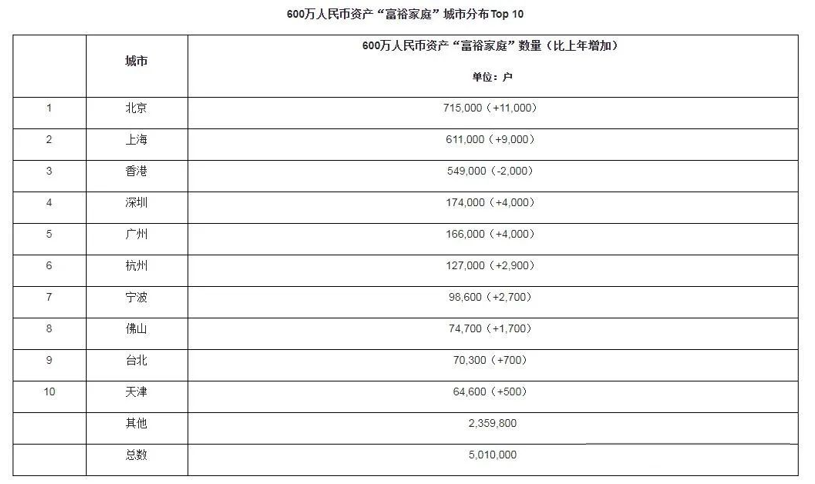 北京依然是拥有最多600万人民币资产“富裕家庭”的地区,比上年增加1.1万户,达到71.5万户,增幅1.6%,其中拥有600万人民币可投资资产的“富裕家庭”数量有26.8万户;广东第二,600万人民币资产“富裕家庭”比上年增加1.3万户,达到69.2万户,增幅1.9%,其中拥有600万人民币可投资资产的“富裕家庭”数量有25.6万户;上海第三,600万人民币资产“富裕家庭”比上年增加9.000户,达到61.1万户,增幅1.5%,其中拥有600万人民币可投资资产的“富裕家庭”数量有21.4万户;香港第四,600万人民币资产“富裕家庭”比上年减少2.000户,达到54.9万户,降幅0.4%,其中拥有600万人民币可投资资产的“富裕家庭”数量有19.3万户;浙江第五,600万人民币资产“富裕家庭”比上年增加9.000户,达到52.5万户,增幅1.7%,其中拥有600万人民币可投资资产的“富裕家庭”数量有18.5万户。