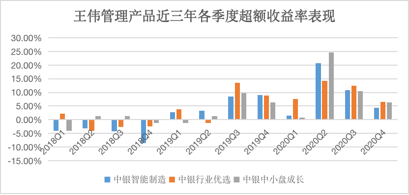在2018年只有零星几个季度能获得超额收益;2019年绝大多数季度能获得超额收益;到了2020年,三只产品各季度均取得了超额收益;可见:近三年王伟管理的产品单季度超额收益率持续改善。但如果投资者一开始就关注短期表现,则很可能错过后续的超额收益。