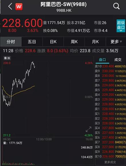 与此同时,当天上午11点30分左右,阿里巴巴涨超3.6%。