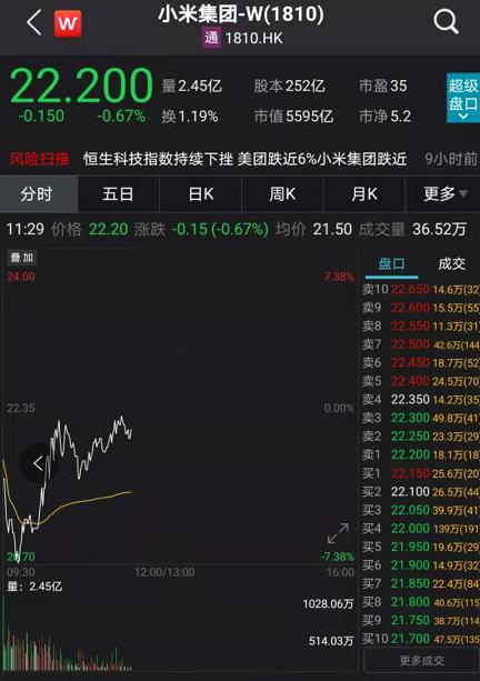 小米集团股价跌幅也出现明显收窄。11点30分左右,股价跌幅从7%收窄1%以内。
