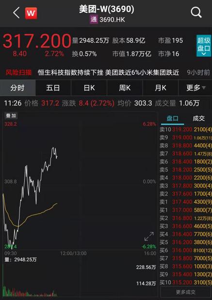 以美团为例,当天上午开盘跳水后,美团股价一度跌超7%以上,股价最低触达289港元,而随后美团股价快速拉升并翻红,涨幅超1.5%以上,股价触达316港元。截至上午11点20分左右,美团张超2.7%以上,盘中振幅超9%以上,市值拉升超1800多亿港元。