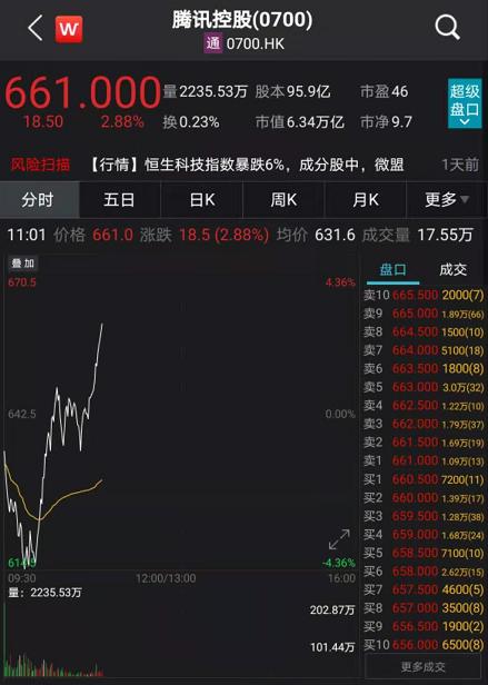 当天上午,腾讯控股从跌超4%到一路转涨超2%以上。截至11点左右,腾讯控股股价报661港元,总市值6.3万亿港元。