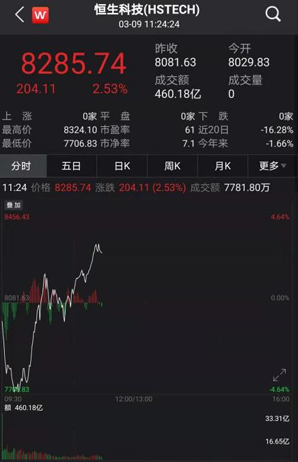 3月9日早盘,港股市场走势跌宕起伏,令人心跳不止。开盘之初,恒生指数高开涨0.44%,随后指数迅速翻绿,跌0.75%以上。其中,恒生科技指数更是上演快速过山车行情,指数一度跌超4%以上,其中网易、小米等龙头股领跌,指数一度失守8000点。