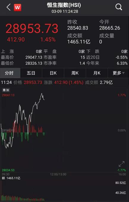 从恒生指数走势来看,尽管开盘高开低走,指数一度跌近1%。但在9:57左右,恒指出现了快速拉升趋势,并迅速翻红;10:10分左右,恒生指数一度涨超1%以上。短短20分钟,恒生指数拉升超550点。截至11点20分左右,恒生指数涨超1.45%。