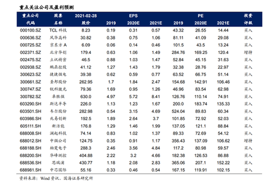 面板行业重点推荐:京东方 A 和 TCL 科技;其他方面,半导体板块,重点推荐业绩确定性较强、景气度较好的功率半导体、部分 IC 设计和设备领域,重点推荐:斯达半导、捷捷微电、韦尔股份、卓胜微、华峰测控、北方华创、新洁能等;消费电子,重点推荐两个方向:具备较好成长性的终端品牌,重点推荐:传音控股;在供应链中持续推荐未来 2-3 年成长路径清晰的行业龙头,重点推荐:立讯精密、鹏鼎控股。