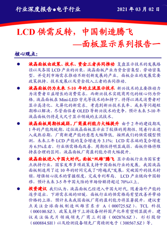 中国银河在3月2日研报中表示,液晶面板已经进入中国大时代。随着海外产能的逐步退出,下游需求端的回暖,面板行业的供需格局有望改善并带动价格的上涨,预计未来我国面板厂商的盈利能力将显著提升,建议重点关注全球面板制造双雄京东方A ( 000725.SZ )、TCL科技(000100.SZ)。政策支持下上游设备材料国产化率有望明显提升,建议关注偏光片领域领先厂商三利谱 ( 002876.SZ )、杉 股份(600884.SH)以及检测设备领先厂商精测电子(300567.SZ)等。