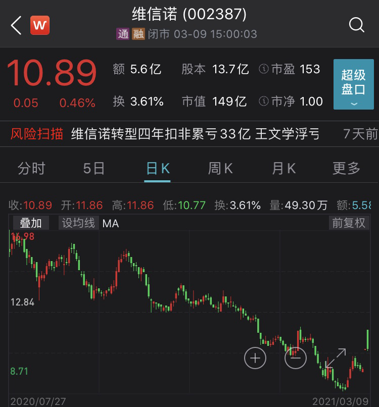 王文学拿下维信诺的控制权代价不菲。通过两次协议转让和一次定增,西藏知合持股总数一度达到4.39亿股,均价为15.31元/股,斥资总计67.26亿元。而维信诺目前的最新股价为10.89元。