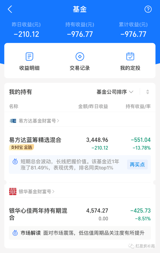 因为“坤坤”很火,我买了他管理的易方达蓝筹精选混合,想着去捧场。但是在买了以后,它不停地跌,跌多了以后,我抱着抄底的念头就想着补仓,又追加了一点钱进去买基金。