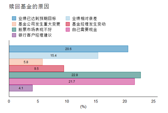 而在赎回基金方面,市场表现不好也是投资者赎回基金的一大因素,不过比例只有2成左右。根据调查问卷数据显示,22.8%、21.7%和 20.6%的投资者因为股票市场表现不好、个人需要现金、基金业绩已经达到预期目标赎回基金,15.4%的投资者会因为基金业绩与其他投资收益相比较很差赎回基金。仅有4.1%的投资者表示他们会因银行客户经理的建议赎回基金。