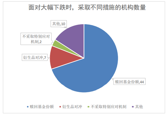 对于市场的下跌,机构投资者又是如何应对的呢?根据报告显示,机构投资者在面对市场风险释放、大幅下跌时主要采取的措施是赎回基金份额。在所有63家机构中,44家机构选择赎回基金份额,7家选择使用衍生品对冲,2家机构选择不采取特别应对机制,10家机构选择其他,其中7家表明会依据后市判断、分析导致市场波动的原因,灵活应对,2家机构暂未投资公募基金(均为期货公司),1家机构目前策略以固定收益类基金为主,不涉及上述问题。