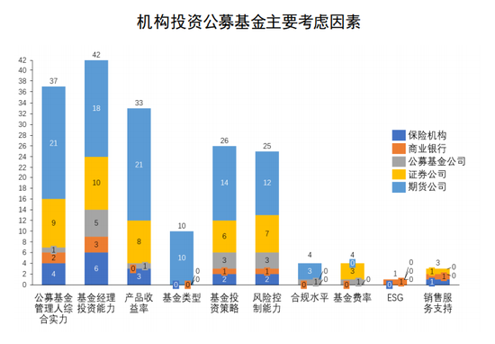 还有在选择购买基金的关注点上,机构投资者与个人投资者也有明显不一样的地方。机构投资者在考虑是否投资公募基金时,主要考虑因素是基金经理投资能力、公募基金管理人综合实力和产品收益率。相较于机构投资者主要关注管理人实力,个人投资者更加关注业绩和名气。