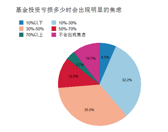 虽然说部分投资者喜欢在市场调整中买基金,但是跌到一定程度,还是会产生焦虑。根据调查问卷数据显示,89.3%的投资者表示投资亏损会导致焦虑,其中亏损少于10%时会焦虑的投资者占6.5%,亏损10%-30%会焦虑的投资者占32.2%,亏损30%-50%会焦虑的投资者占35.0%。亏损50%以上才会焦虑的占15.7%。