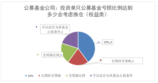 5家公募基金公司中,2家机构在亏损达20%是会考虑换仓,采用长期持有策略、无明确比例限制、不以此作为单基金止损条件分别各有1家机构;以上四类占比分别为40%、20%、20%。