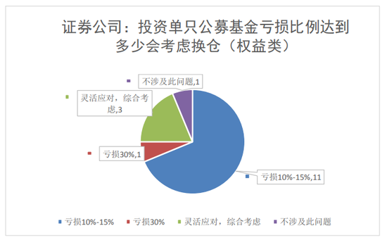 16家证券公司中,11家机构表示亏损比例达到10%-15%会考虑换仓,3家机构表示会灵活应对、综合考虑,1家机构亏损达30%会考虑换仓,1家机构主要投资于货币基金,不涉及此问题;以上四类占比分别为69%、19%、6%、6%。