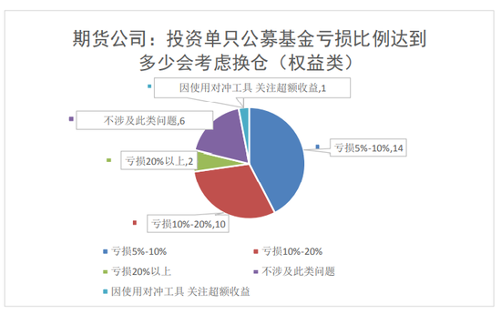 33家期货公司中,14家机构亏损达5%-10%是会考虑换仓,10家机构亏损达10%-20%会考虑换仓,6家机构不涉及此类问题,2家机构亏损达20%以上会考虑换仓,1家机构因使用对冲工具,主要关注超额收益;以上五类占比分别为43%、30%、18%、6%、3%。
