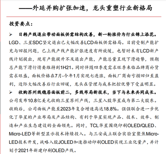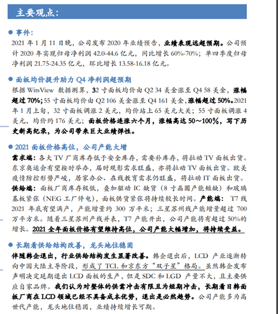新时代证券在1月15日研报中表示,面板迎来强势周期,公司作为行业龙头将显著受益于行业供需格局的改善,上调公司 2020-2022 年的营业收入为 711.9/925.4/1110.5 亿元,上调公司归母净利润为 39.9/60.7/74.0 亿元,EPS 分别为0.28/0.43/0.53 元/股,1 月 12日收盘价下对应 PE 为 30/20/16 倍,维持“强烈推荐”评级。
