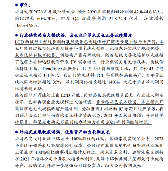 国联证券在1月13日研报中表示,预计TCL华星2020-2022年营业收入为451.91、622.60.、657.27亿元,同比增长32.94%、37.77%、5.57%。TCL科技2020-2022年营业收入为756.00、1200.68、1349.97亿元(未合并三星苏州线)。归母净利润为42.79、92.22、101.91亿元,同比增长63.45%、115.54%、10.51%,EPS为0.30、0.66、0.73元,对应P/E为28x、13x、12x。基于行业供需结构改善与公司龙头技术与地位优势,首次覆盖给予推荐评级。