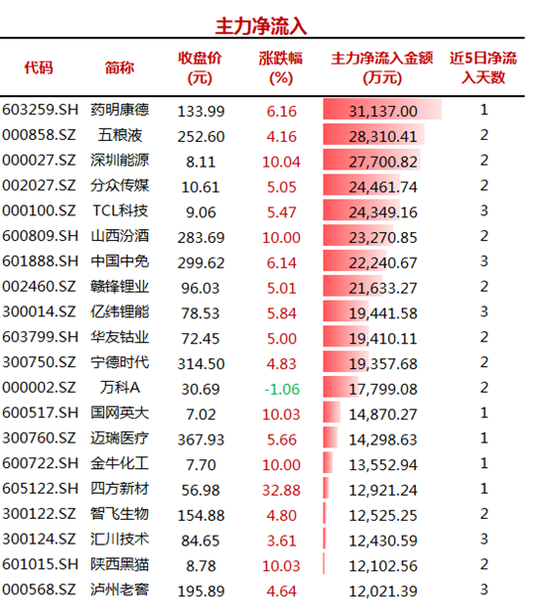 今日主力资金净流入居前的个股为药明康德、五粮液、深圳能源、分众传媒、TCL科技、山西汾酒、中国中免等。