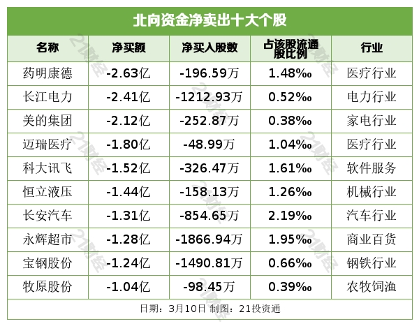 北向资金净卖出药明康德(603259.SH)、长江电力(600900.SH)、美的集团(000333.SZ)、迈瑞医疗(300760.SZ)、科大讯飞(002230.SZ)居前,其中,药明康德被净卖出2.63亿元,长江电力被净卖出2.41亿元,美的集团被净卖出2.12亿元,迈瑞医疗被净卖出1.80亿元,科大讯飞被净卖出1.52亿元。