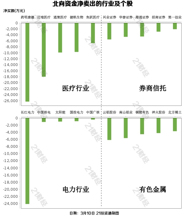 北向资金减持了38个行业,其中医疗行业最多,净卖出金额达6.42亿元,其次是券商信托行业,净卖出3.21亿元。