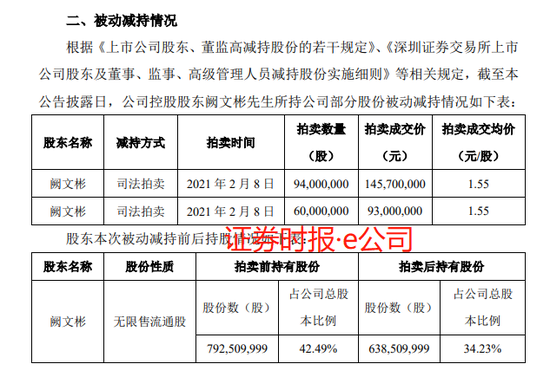 2021年2月8日,阙文彬所持有的*ST恒康1.54亿股股份被甘肃省高级人民法院进行了公开司法拍卖,合计拍得资金约2.39亿元。截至该公告披露日,阙文彬所持*ST恒康股份累计被拍卖1.56股,占上市公司总股本的8.34%;拍卖完成后,阙文彬仍持有*ST恒康6.39亿股,占该上市公司总股本比例为34.23%。