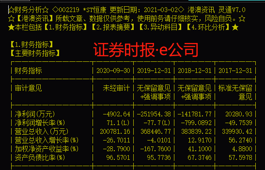 值得关注的是,由于2018年~2019年,*ST恒康净利润分别亏损14.18亿元和25.19亿元,该上市公司被“披星戴帽”(*ST恒康);如今,*ST恒康在2020年前三季度中,营业收入虽超过20亿元,但净利润依然亏损逾4900万元,上市公司已到了“生死攸关”关键时刻。