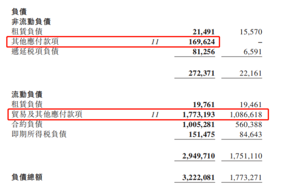 不过,在29.5亿元的流动负债中,剔除合约负债10亿元,贸易及其他应付款项有17.73亿元,基本构成了短期负债的“全部”。财报显示,17.73亿元的该笔应付款,其中贸易应付款为3.74亿元,其他应付款约为14亿元,而贸易应付款有97%以上都需在1年内支付。